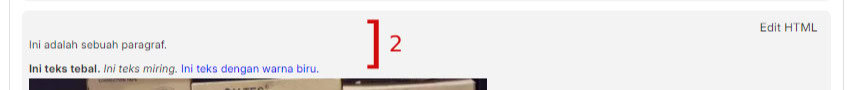 Dan ini adalah kode untuk seksi 2, di seksi ini kodenya digunakan untuk memberikan style pada teks, terlihat <strong> untuk membuatnya menjad bold, <em> untuk menjadi italic, <span style=”color: > untuk memberikan warna pada teks.