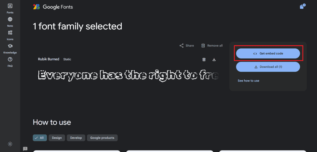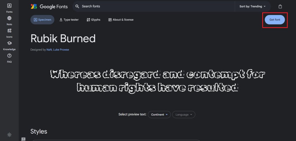 Jika anda ingin menggunakan font custom yang tidak terdapat di print setting anda harus menggunakan Custom CSS pada setting print format dan menggunakan Custom HTML pada Print Format Builder. Anda dapat memilih font yang ingin digunakan lewat Google Fonts(https://fonts.google.com/). Cara mendapat kan kode CSS dan HTML untuk font yang ingin digunakan seperti gambar dibawah. Saya memilih mamakai font Rubik Burned sebagai contoh.