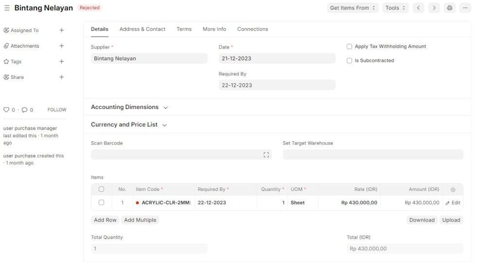 Dan jika halamannya dibuka oleh “Purchase Manager” akan terlihat tombol “action” di atas kanan, disini “Purchase Manager” dapat meng approve atau meng reject Purchase Order buatan “purchase user”.