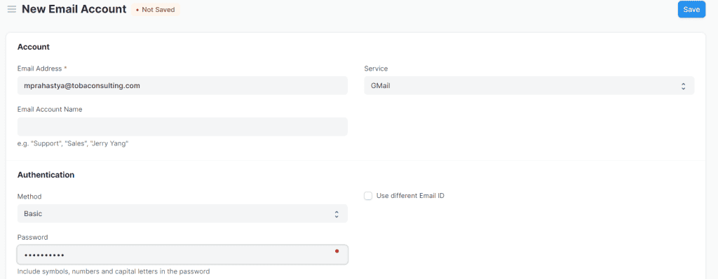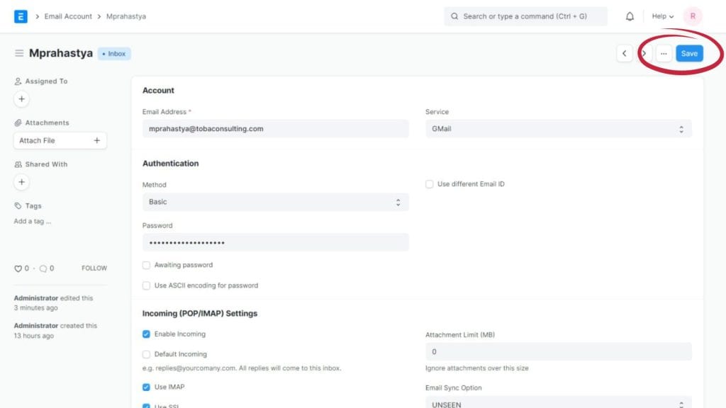 - Klik ‘Save’ dibagian atas ujung sebelah kanan, untuk membuat akun email. ERPNext akan secara otomatis mengambil pengaturan email dan memverifikasi koneksi.
