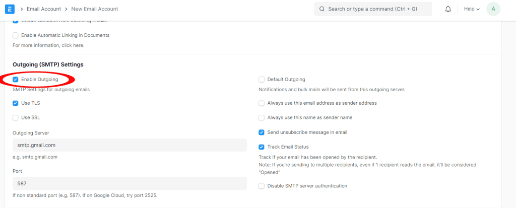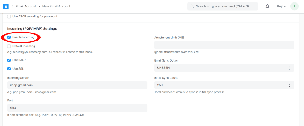 - Pilih kotak centang ‘Enable Incoming’ dan ‘Enable Outgoing’ jika Anda ingin menerima dan mengirim email dari ERPNext. Anda juga dapat menentukan opsi ‘Append To’ untuk menghubungkan email masuk ke jenis dokumen tertentu, seperti Lead, Opportunity, Issue, dll.