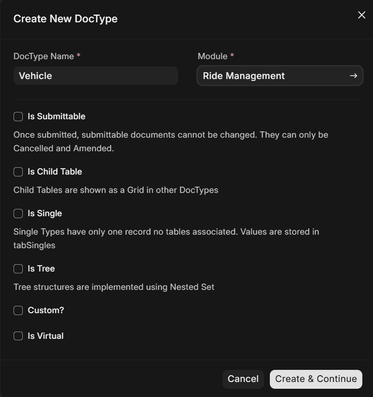 Untuk DocType pertama kita, buatlah DocType bernama Vehicle dengan module Ride Management seperti gambar di samping. Kemudian, klik Create & Continue.