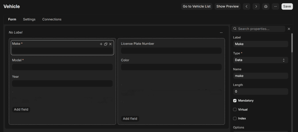 Setelah DocType terbuat, Anda akan melihat form view dari DocType Vehicle.
