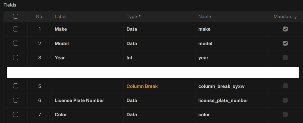 Setelah menambahkan semua fields yang diperlukan, jangan lupa untuk menyimpan DocType. Frappe akan otomatis membuat tabel dalam database untuk menampung data yang sesuai dengan DocType tersebut. Tabel pada database ini akan selalu memiliki nama sesuai format: tab[Nama DocType]. Maka, Vehicle akan memiliki nama tabel tabVehicle pada database.