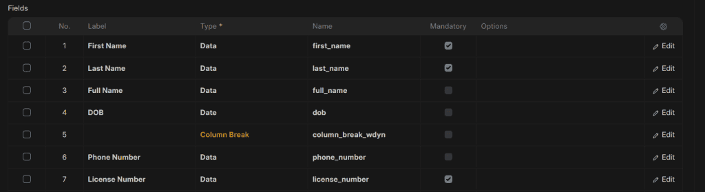 Di view ini, Anda dapat membuat field/kolom dari DocType Anda sekaligus mengatur UI form view-nya. Untuk kolom yang hanya berisi teks singkat, Anda dapat memilih Type Data. Anda juga dapat menentukan Label dan Name dari setiap kolom. Setiap field dapat didefinisikan dengan tipe data yang spesifik seperti ‘Data’, ‘Select’, ‘Link’, ‘Check’, dll.