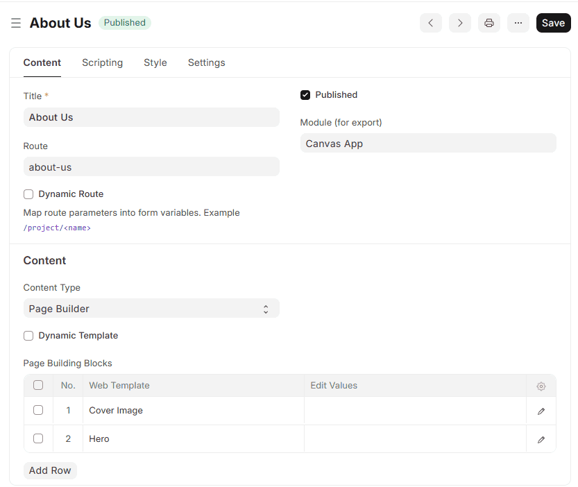 Route pada web page ini dapat kita tentukan sendiri, atau akan diisi secara otomatis oleh Frappe sesuai dengan Title yang kita tentukan.