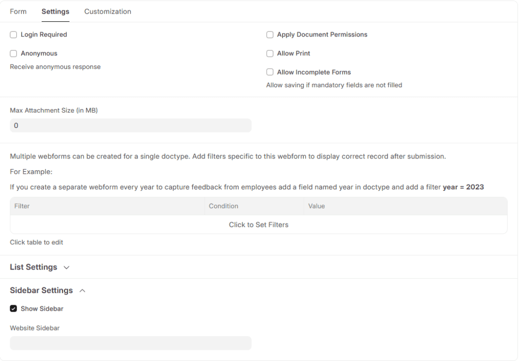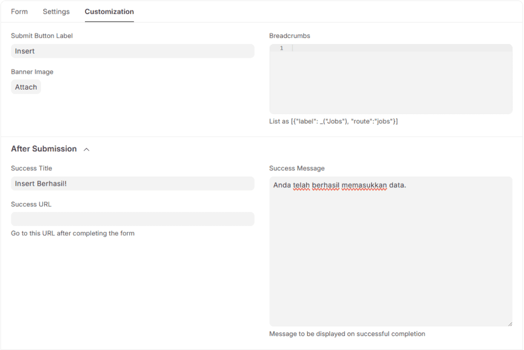 Terdapat banyak customization yang dapat kita pilih pada tab Settings dan Customization sehingga kita dapat membuat Web Form yang dinamis dan lengkap tanpa harus menyentuh keyboard Anda sekalipun. Anda dapat mengakses Web Form ini dengan menggunakan URL [site-url]/[route]/new.