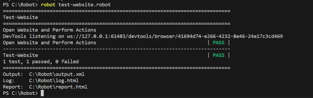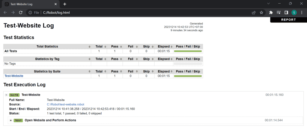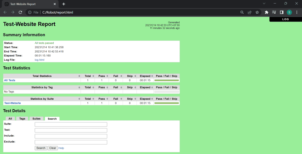 Setelah dilakukan run dengan perintah robot test-website.robot
